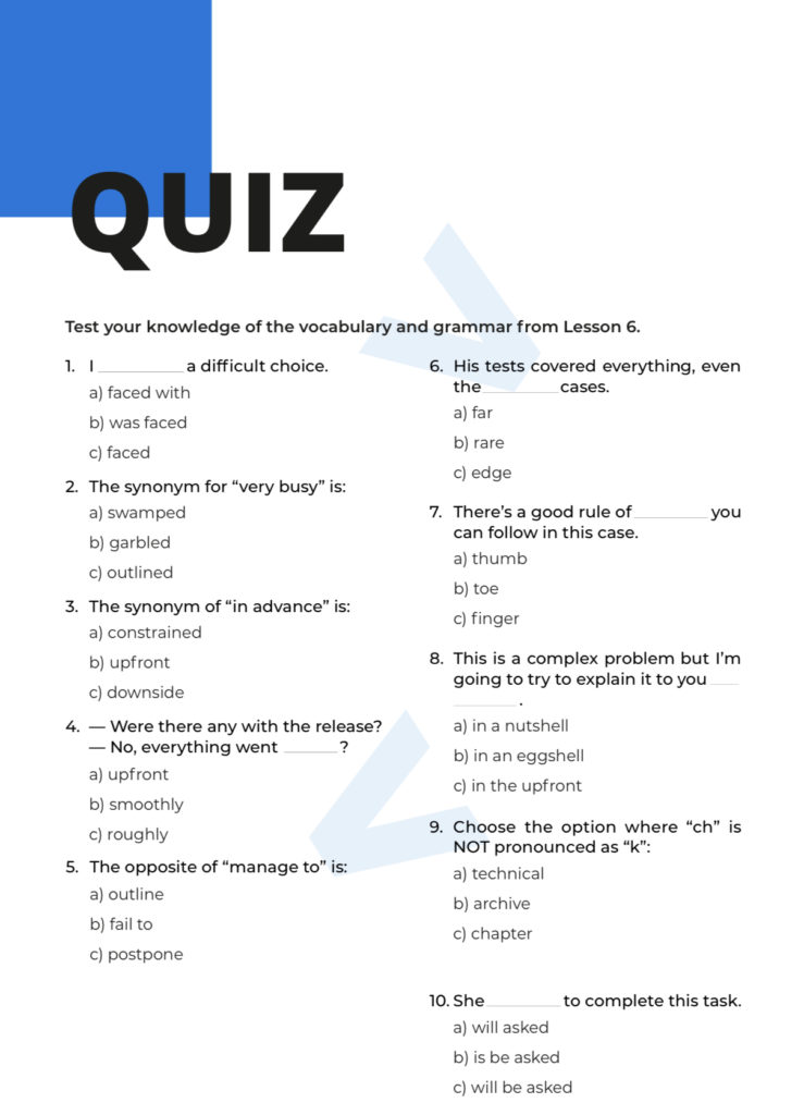 Anna, günlük İngilizce fiillere ve ifadelere teknik kelimeler eklemekte oldukça başarılı. Ses dosyaları da aynı derecede etkileyici: bol bol bulunurlar ve orijinal konuşma dilinde ve hızındadırlar. Gramer seven öğrenciler, fiil kalıpları ve ek tabloları içeren dilbilgisi bölümlerinden memnun kalacaklardır.