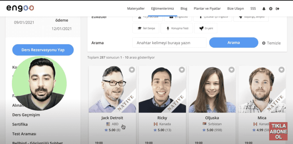 Ders rezervasyonu yapmak için müsait olan eğitmenleri ya da tüm eğitmenleri tarayabilirsiniz, öğretmenlerin nereli olduklarını görebiliyorsunuz. Eğitmeniniz Amerikalı, İngiliz veya anadili İngilizce olan herhangi bir ülkedense onun üzerinde native yazıyor ve onların ders ücreti biraz daha pahalı. Ama ben olsam illa Amerikalı vs. olsun demem. Ülkemizde bu konuda bir önyargı var ama insanlar zaten buraya eğitmen olarak alındıkları için iyidir diye düşünüyorum. Ayrıca bütün öğretmenlerin profillerine tıklayıp videolarını izleyebilir, konuşmalarını da duyabilirsiniz. Ne kadar farklı ülkeden insanla konuşursanız o kadar iyi olur sizin için. Çünkü gerçek hayatta da İngilizceyi kullanırken tüm dünyadan insanlarla konuşacaksınız. Sadece İngiliz veya Amerikalılarla konuşmayacaksınız.
