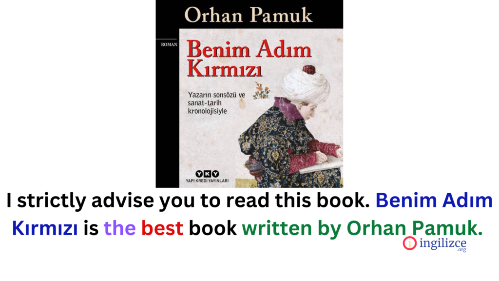 I strictly advise you to read this book. Benim Adım Kırmızı is the best book written by Orhan Pamuk. / Bu kitabı mutlaka okumanızı tavsiye ediyorum. Benim Adım Kırmızı Orhan Pamuk’un en iyi kitabıdır.