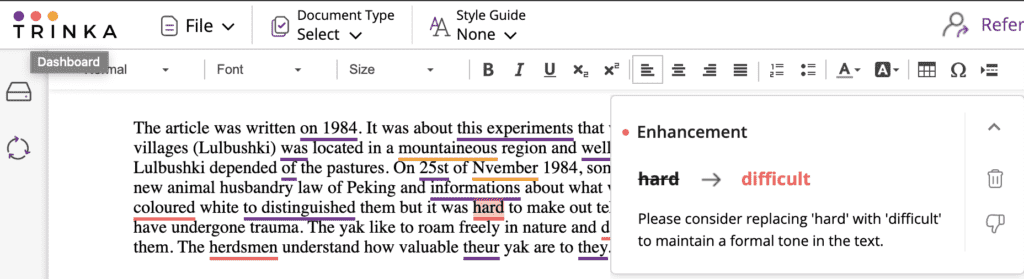 Bununla birlikte Trinka, milyonlarca iyi yazılmış makaleyi ve araştırma yazısını taradığı için size en iyi öneriyi sunabiliyor. Yapay zeka teknolojisiyle güçlendirilmiş bu dil bilgisi düzelticisi, karmaşık hatalarınızı dahi bularak düzeltiyor. Akademik yazınıza ve yazınızın bilimsel diline uygun öneriler sunuyor. Trinka bilhassa akademik ve teknik yazarlara yardımcı olmayı hedefliyor. Bu yüzden de 3000’den fazla karmaşık dil bilgisel hatayı ve kötü cümle dizimini düzeltebiliyor.